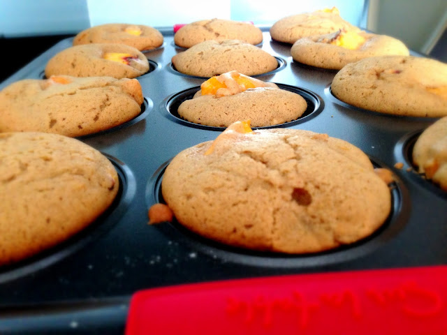 Preheat oven to 350 and line the muffin tin with cupcake liners (in fact, this muffin is quite cake-like - if you added frosting on top it would just go over nicely as a not-too-sweet peach cupcake!).